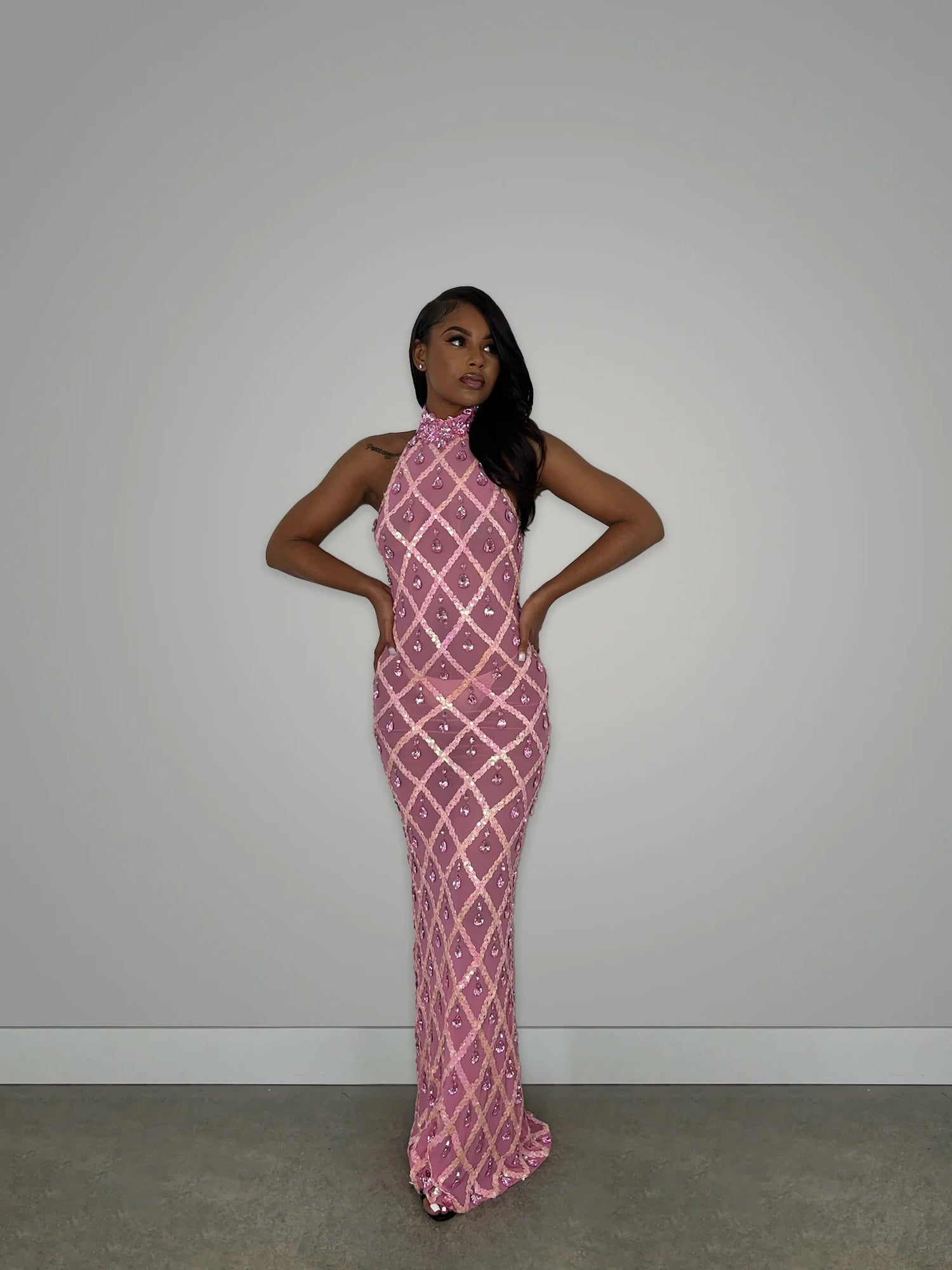 This Diamond Maxi Dress exudes elegance and charm! Its flowing silhouette and shimmering accents make it perfect for any glamorous occasion. Simply stunning!